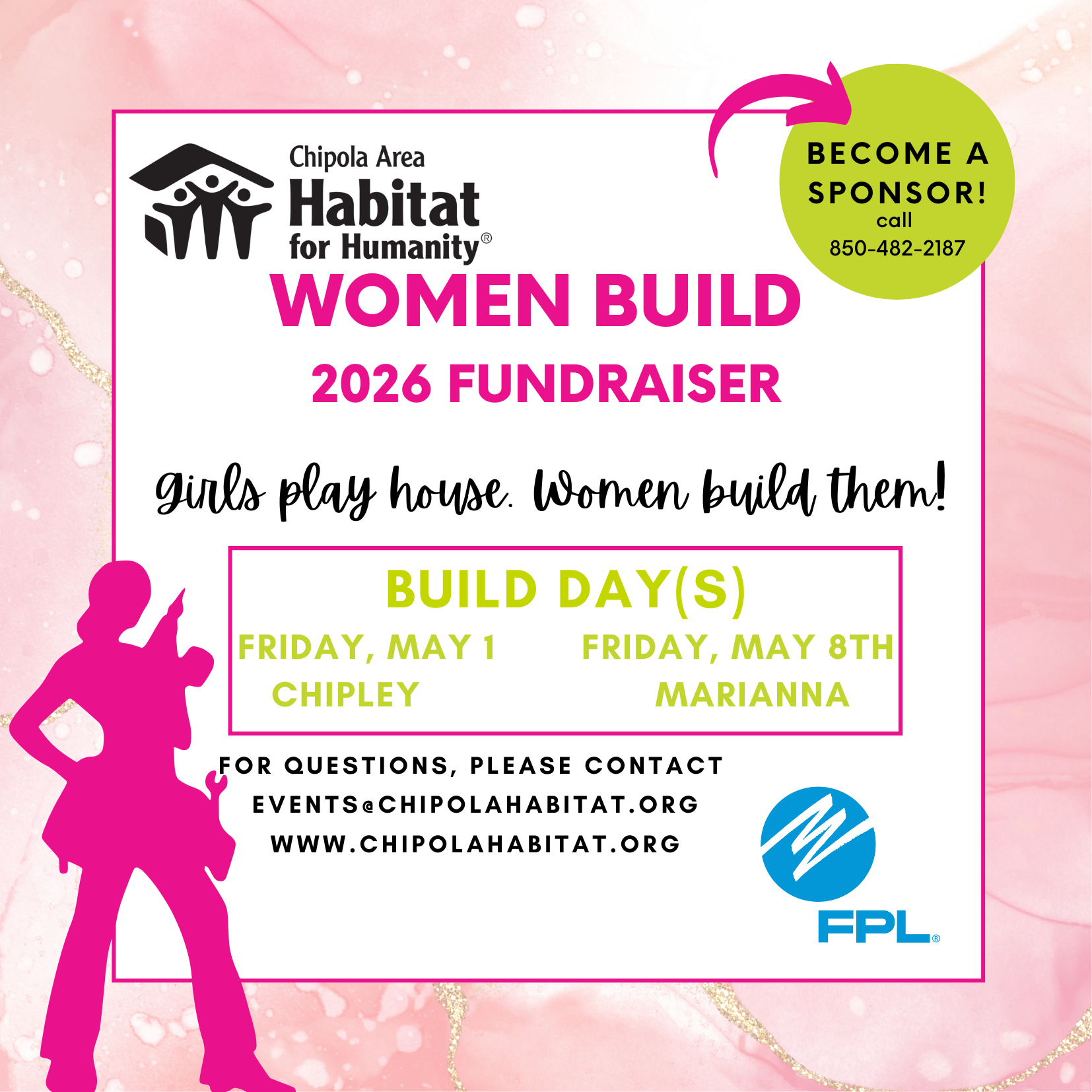 Women Build 2026 is special in that we are offering TWO DAYS and TWO LOCATIONS. Based on feedback from last year, we are planning a build day in Chipley on May 1, AND a day in Marianna on May 8. With your sponsorship, you will be highlighted twice, with opportunities to serve at either or both.